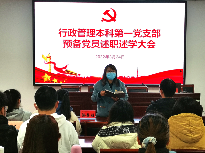 为加强党员教育管理,发挥先锋模范作用,促进支部党员之间的交流与学习,3月24日上午,嫩草影院 行政管理本科第一党支部在学院第三会议室召开预备党员述职述学大会。党支部书记骆春丽、本科2019级辅导员孙少飞和支部27名党员参加会议。