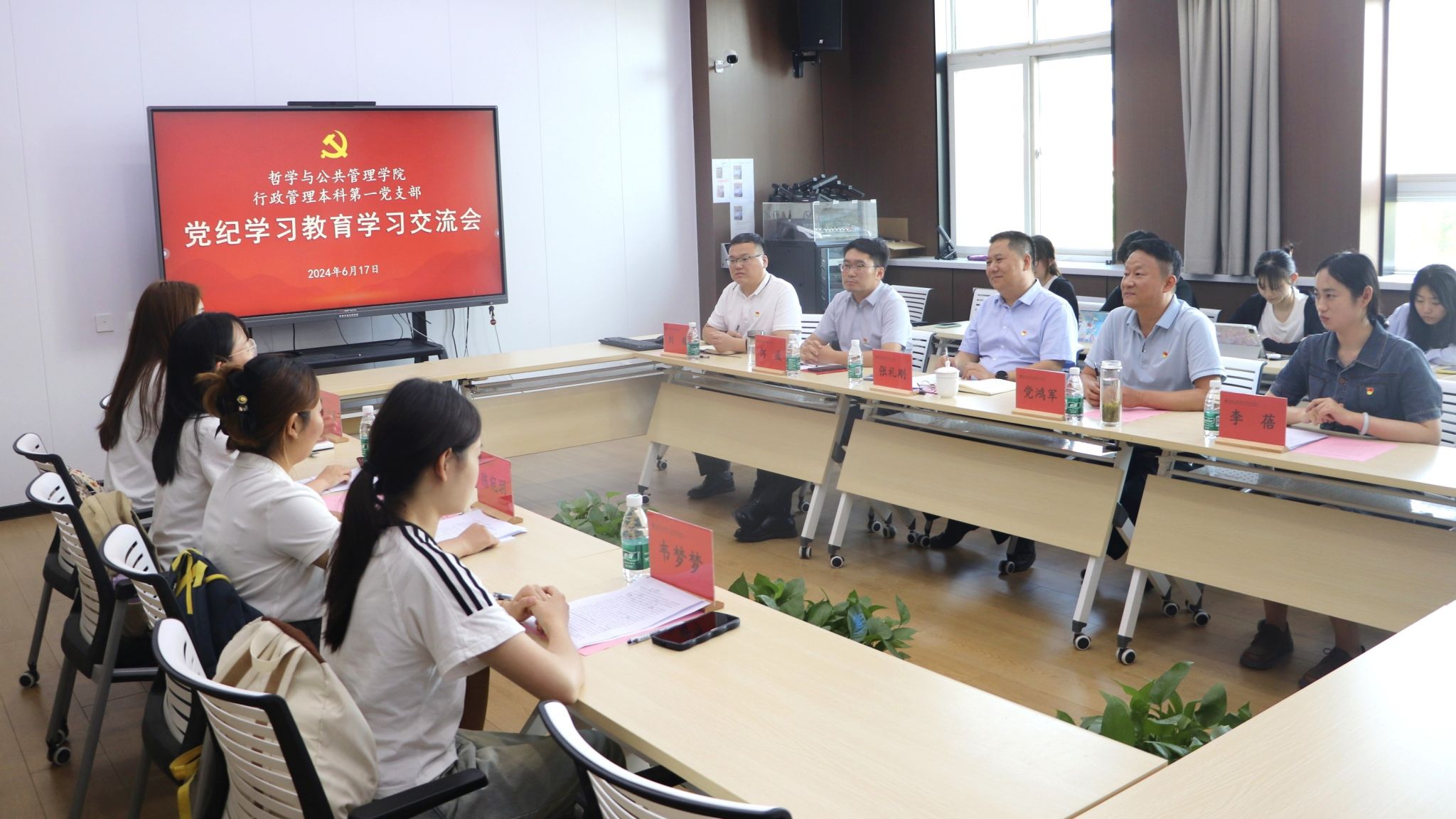 为深入学习贯彻习近平总书记关于全面加强党的纪律建设的重要论述,认真学习新修订的《中国共产党纪律处分条例》,按照学校党纪学习教育要求,6月17日下午,嫩草影院 行政管理本科第一党支部在学院第二会议室召开党纪学习教育学习交流会,副校长张礼刚作为行政管理本科第一党支部联系校领导出席会议。学院党委书记党鸿军,学院党委副书记、行政管理本科第一党支部书记何威,学院团委负责人、哲学研究生党支部书记刘耀,本科2023级辅导员、行政管理本科第二党支部书记李蓓和行政管理本科第一党支部全体成员参加,会议由何威主持。