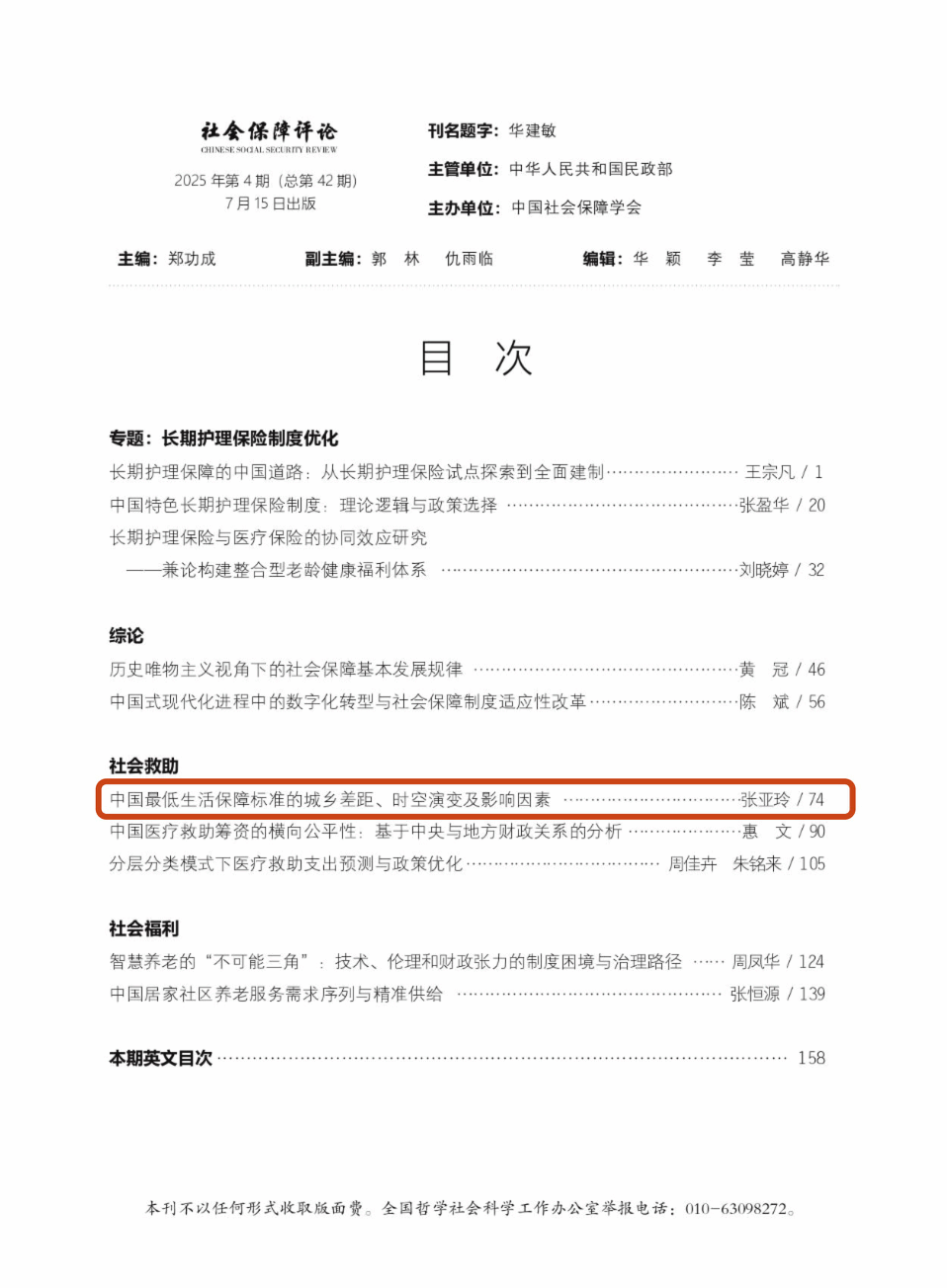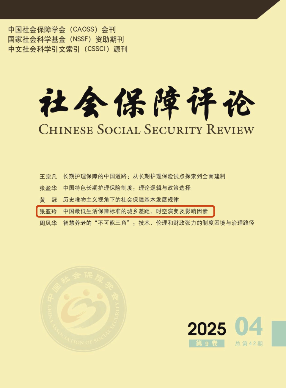 嫩草影院 张亚玲老师最新研究成果“中国最低生活保障标准的城乡差距、时空演变及影响因素”在社会保障领域权威期刊《社会保障评论》(2025年第4期)上发表,并成功入选封面论文。