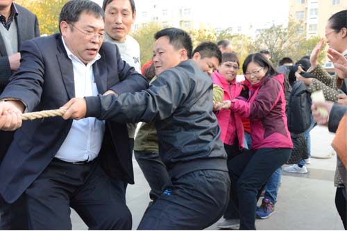 拔河比赛采取三局比赛制,由八名教师两名学生组成队伍。第一局政治队对管理队,在前两局平局的情况下,管理队老师及时运用专业知识对队伍进行优化调整,以绝对的优势战胜政治队。在哲学队与行政队的比赛中,两队伍实力相当,队员个个压低重心,脚跟紧贴地面,使红线反复易主,比赛现场加油声、呐喊声此起彼伏,最终行政队艰难取得本局的胜利。经决赛比拼,管理队取得了拔河的胜利。