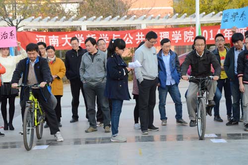 在有趣而激烈的自行车慢骑比赛中,由男老师载女老师完成,老师们相互配合,短短的车程变得漫长而曲折,队员争相减缓前行速度,既兴奋又谨慎的动作,因身体不协调展现出了搞怪的动作,引得场外师生大笑,最终管理队取得自行车慢骑第一名。