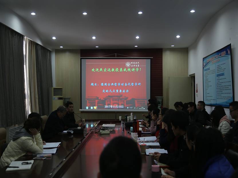 2017年11月15日下午,湖南师范大学燕宏远教授应邀来到嫩草影院 ,在嫩草影院 3楼小会议室为师生主讲了题为《德国古典哲学对当代哲学研究的几点重点启示》的学术讲座,副院长姬志闯教授主持讲座,哲学系焦卫华老师、陈联营老师与哲学、政治学等相关专业学生共同参会。