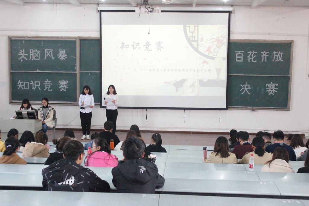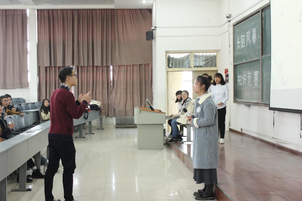 决赛采用现场竞答方式,分为“知识大比拼”、“心有灵犀”、“共渡难关”三个板块。第一环节中,选手们轮流作答,得分较高者胜出。各参赛选手反应迅速,竞相展现丰富的百科知识。激烈的复活赛后,8名选手进入下一轮比赛。在“心有灵犀”环节中,选手两人一组,共四组,各组队员密切配合,难分伯仲,出色流利的对答赢得台下观众阵阵掌声。最终,6名选手成功进入第三环节,展开巅峰对决。在亲友团的帮助下,精彩绝伦的比拼将比赛气氛一次次推向高潮,同学们在积极参与的同时提高了自己的知识技能,丰富了课余生活。