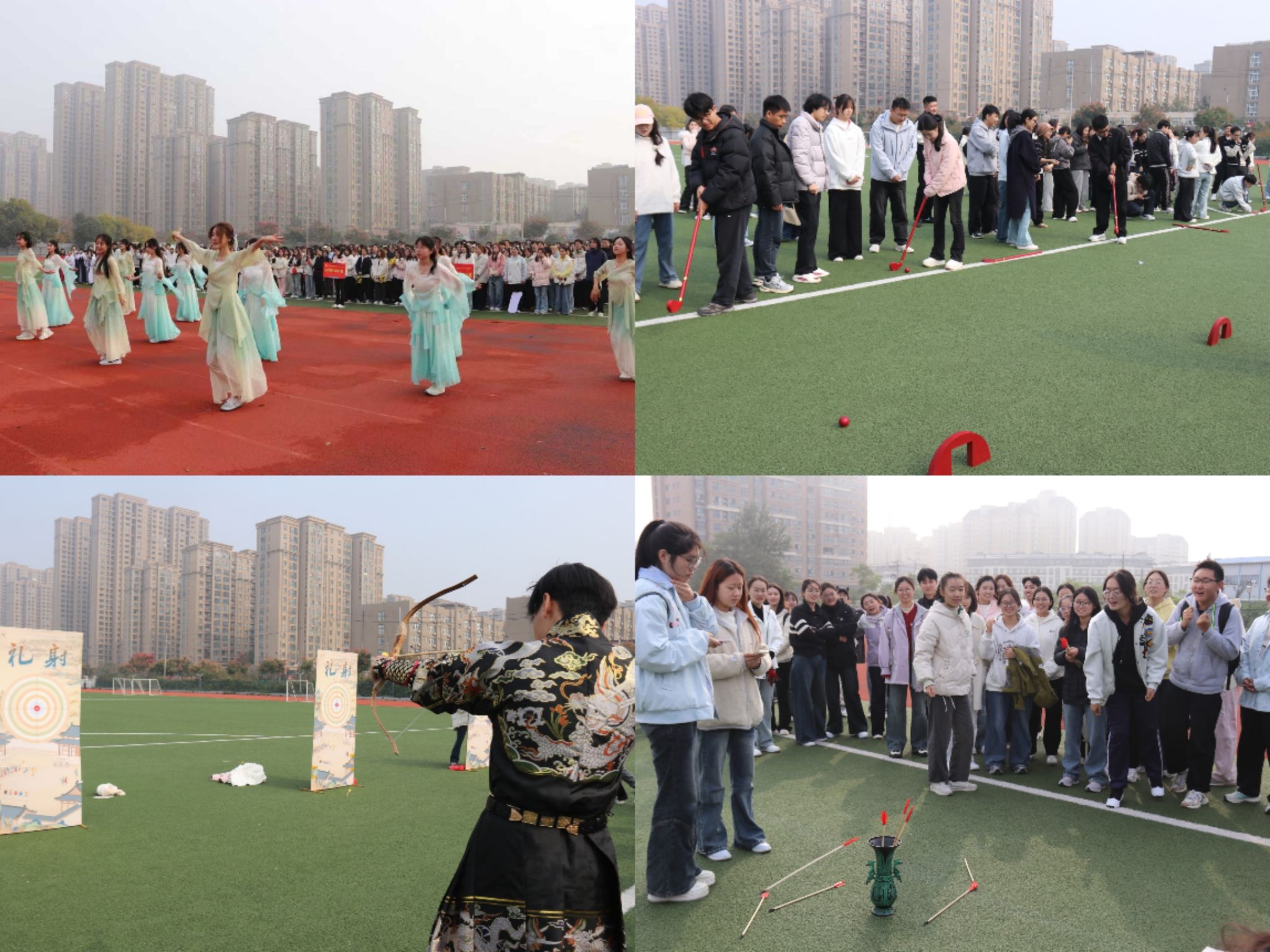 赛事现场,竞技角逐与趣味体验交织绽放。规定项目中,短跑选手疾步如风,尽显速度激情;男子引体向上、女子仰卧起坐赛场,同学们坚持不懈,奋力挑战体能极限;立定跳远项目里,参赛同学每一次跃起,都向着更远目标迸发。趣味项目同样亮点纷呈,飞盘传接默契传接、投壶投掷精准稳健、踢毽子灵活翻飞,让大家在欢乐中体悟协作魅力;礼射与捶丸巧妙融入传统体育文化,选手一招一式尽显韵味,让传统与竞技碰撞出独特火花。