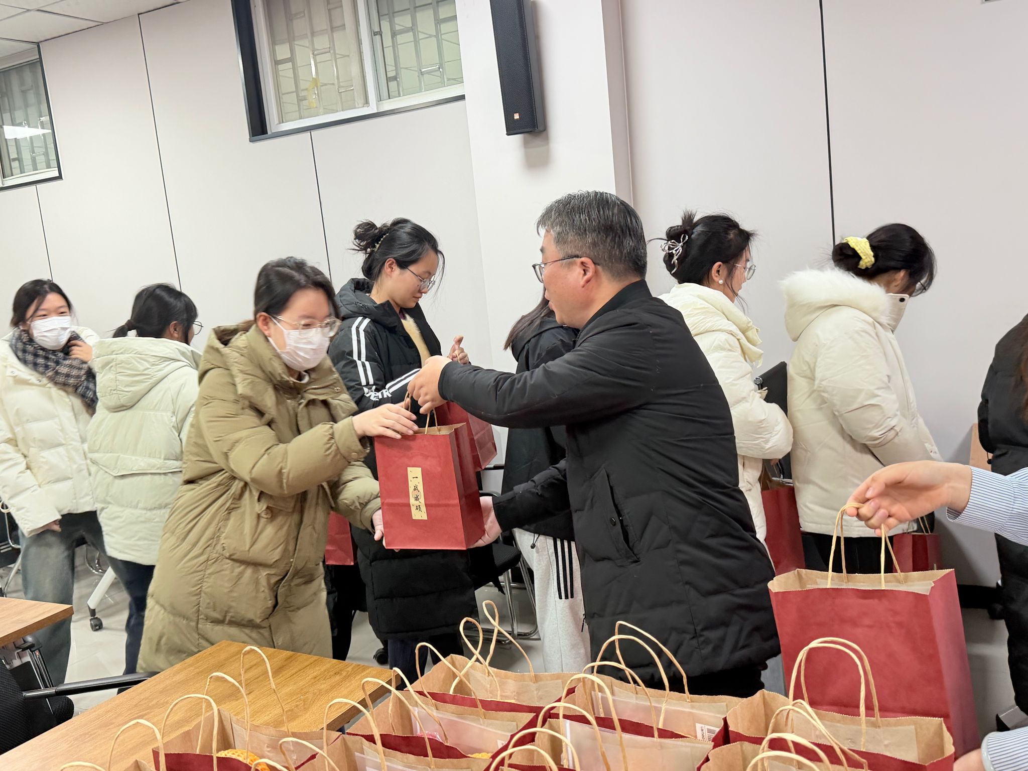 随后,参会领导和老师向考研学子送去祝福并发放“温暖礼包”,鼓励大家坚守初心,以定力、耐力、魄力迎接人生的重要考场。福袋玲珑,情谊深长:饱含甜蜜的苹果与糖果寓意“苹”安顺遂,为奋斗时光注入能量与温暖;向日葵钥匙扣寓意“一举夺魁”的,承载着对学子旗开得胜的美好祝愿。学子们接过这份心意满满的祝福,惊喜与感动溢于言表,纷纷表示将带着学院的殷切期盼,在考研征程中坚定前行。