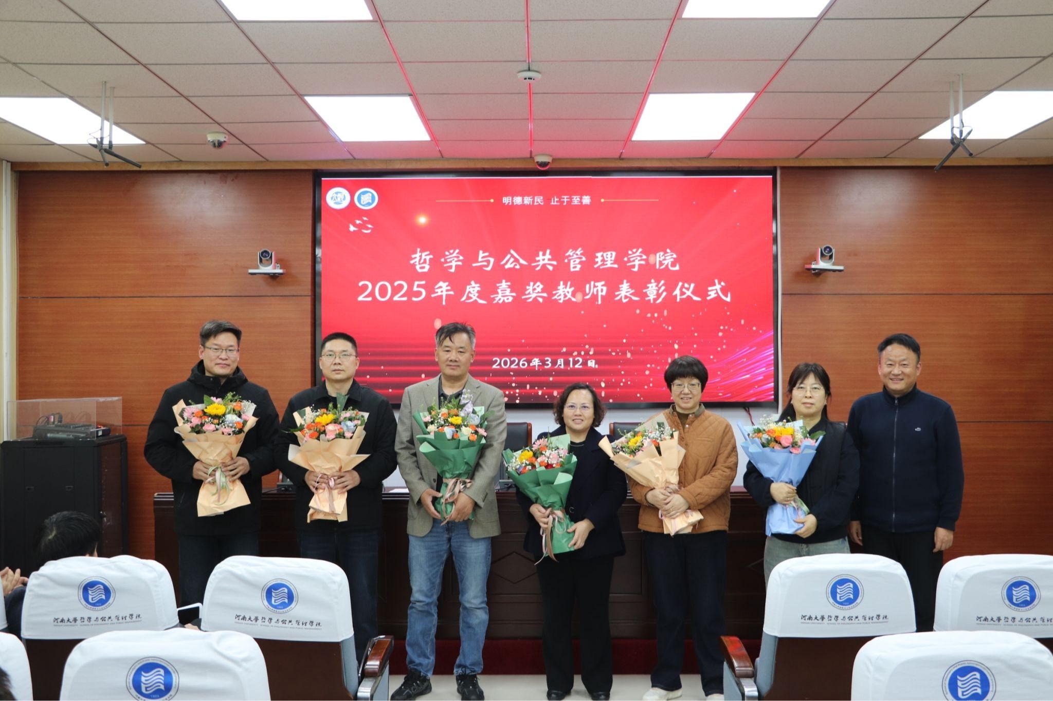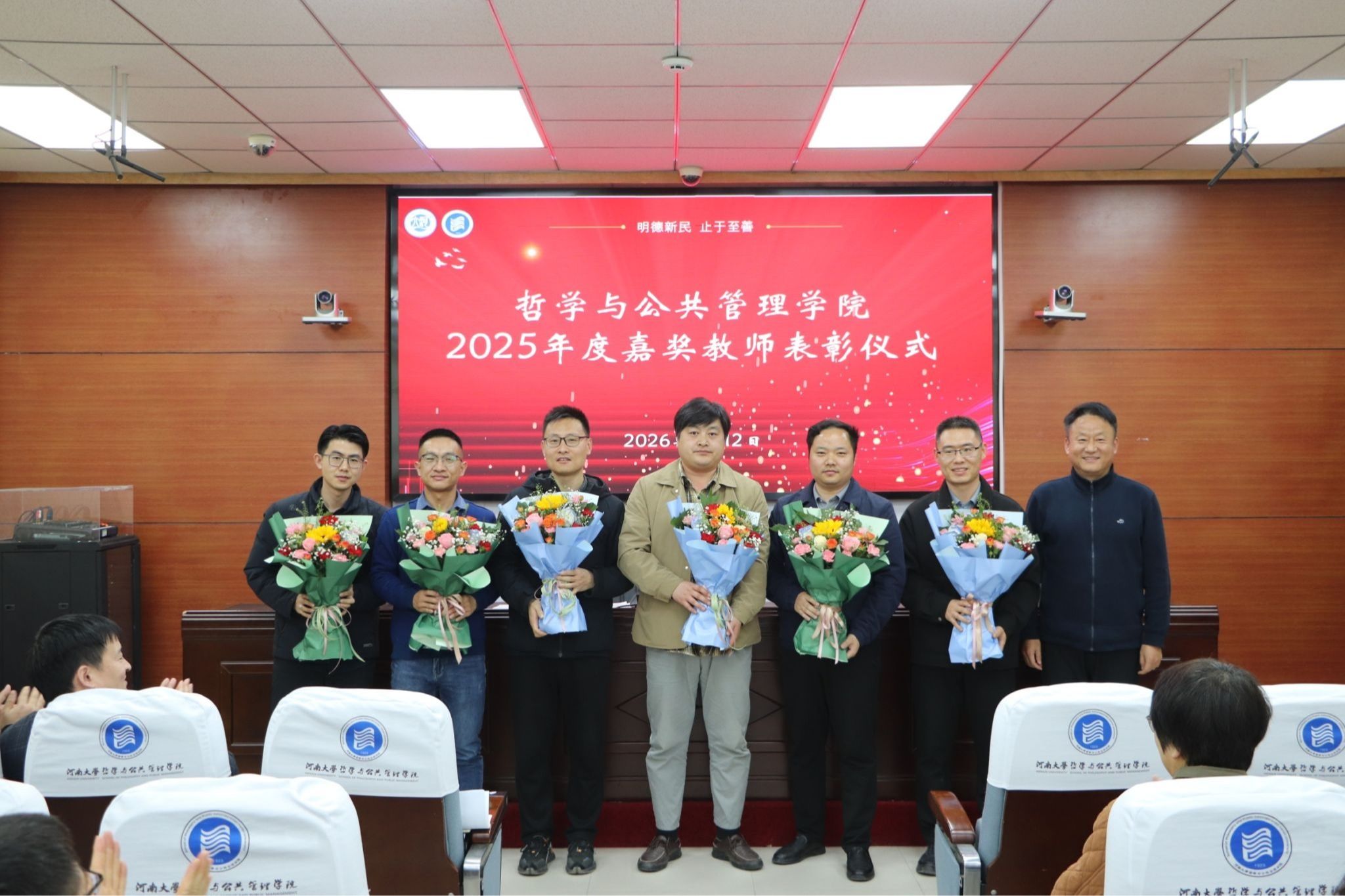 师德是教育之魂,为表彰先进,营造见贤思齐的良好氛围,会议对周靖等14位获得2025年度“嘉奖”荣誉的教师进行表彰。党鸿军代表学院为他们献上鲜花。他号召全院广大教职工要以获“嘉奖”教师为榜样,以开展树立和践行正确政绩观学习教育为契机,积极融入学校综合改革,紧密围绕本年度学院中心工作与重点任务,凝心聚力、真抓实干、攻坚克难,以更加扎实的工作作风、更加昂扬的精神风貌,开拓创新、勇于担当,为推动学院各项事业高质量发展作出新的更大贡献。