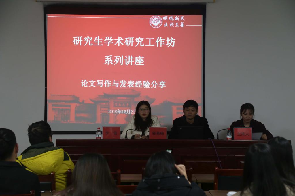 12月2日晚上,以“论文写作与发表经验”为主题的研究生学术研究工作坊在嫩草影院 第三会议室顺利举办,本次活动由嫩草影院 研究生学生会学术部部长李曼娜主持,2017级优秀研究生代表李雪、郭豪楠分别就自身在学术论文写作及投稿发表过程中积累的丰富经验与大家进行分享交流。研究生辅导员乔志灵和18、19级研究生参加了此次活动。