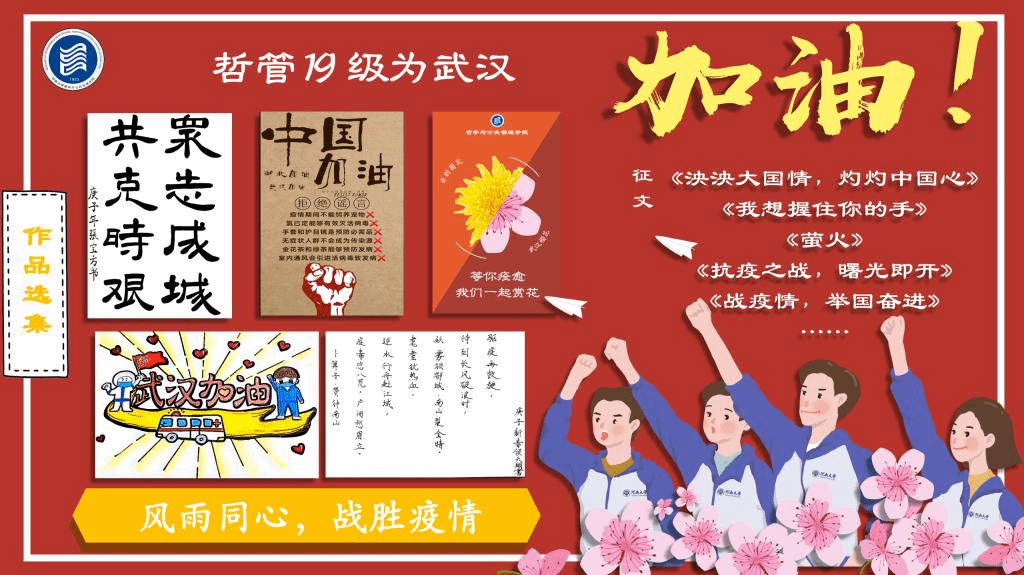 本次活动作品征集设置“文字作品”“设计作品”“摄影作品”和“文艺表演”四个模块,共收到作品百余件。同学们积极参与,充分发挥发挥想象力和创造力,以多样的形式传播青年的力量。通过图片视频、书法字画、诗词散文等多种形式致敬“逆行者”,祝福祖国,表达打赢抗疫攻坚战的决心。