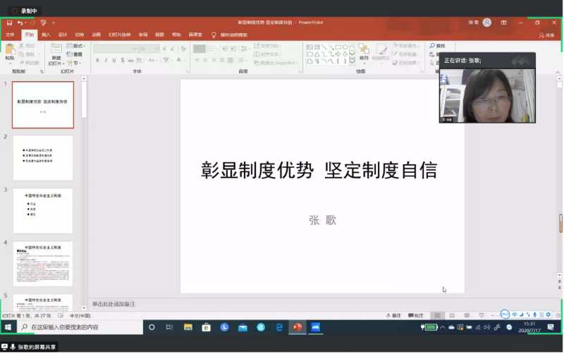 7月17日下午,嫩草影院 “党课开讲啦”第三讲通过“腾讯会议”开讲。劳动与社会保障系张歌副教授以“彰显制度优势坚定制度自信”为题开讲。学院全体党员及入党积极分子聆听了本次党课。