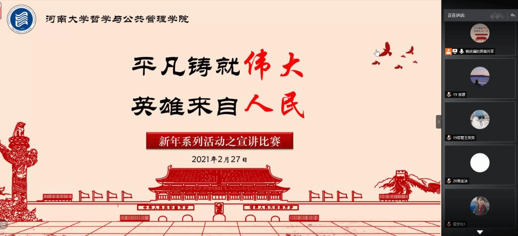 2月27日,嫩草影院 于线上开展“了不起的中国人”主题微故事宣讲比赛。平凡铸就伟大,英雄来自人民。参赛选手将眼光聚焦于身边的人和事,从抗疫情到战洪水,从抗美援朝到脱贫战场,他们声情并茂地将人民英雄的事迹娓娓道来,歌颂他们舍小家为大家、牺牲个人、忠于民族的伟大爱国主义精神。2018级行政管理专业杨佳通过讲述燃灯校长张桂梅扎根山区,坚守教育的故事,诠释了时代楷模于己克俭、为民奉献的大爱无私。2020级公共管理类专业蒋金冰用饱满情感致敬抗美援朝的可爱战士,表达了当代青年人崇尚英雄,不忘初心的理想信念。一个有希望的民族不能没有英雄,一个有前途的国家不能没有先锋,传承英雄是时代永恒不变的主题。
