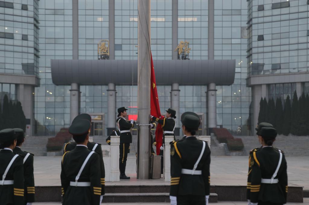 红旗漫卷,盛世如画。迎着初升的朝阳,学校国旗护卫方队戎装齐整、口号嘹亮、步伐铿锵,擎着国旗缓步走向升旗台。伴着高亢激昂的国歌声,五星红旗冉冉升起,迎风飘扬。旗上飘扬着国家尊严,国歌中回荡着爱国激情。师生们怀着激动和崇敬的心情庄重肃立,高唱国歌,行注目礼。