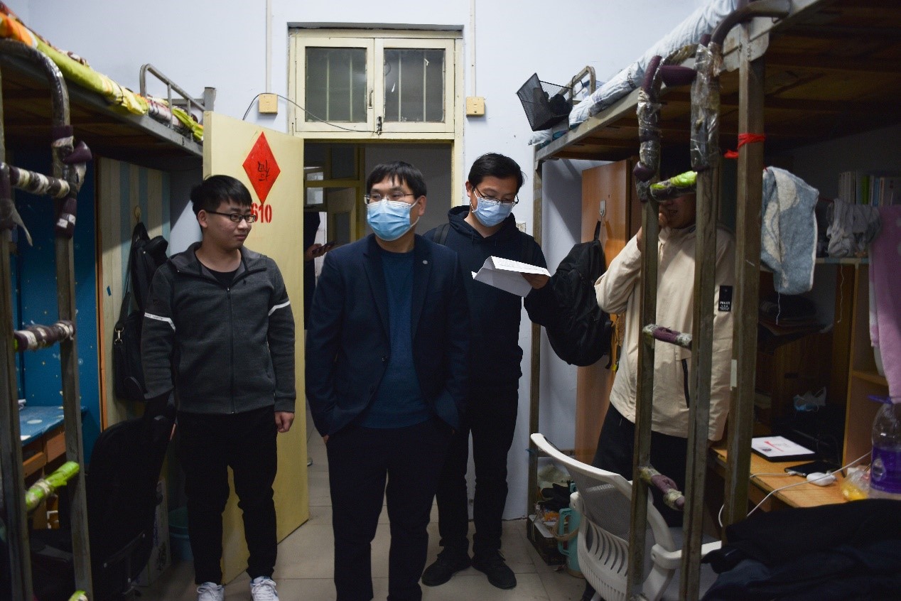 为进一步推动学院疫情防控工作落细落实,强化学生防疫安全意识,关爱学生心理健康状况,学院党委书记党鸿军、院党委副书记骆春丽、副院长赵炎峰、副院长马翠军、副院长田丰韶和副院长齐月祥一行,分别于4月11日、14日前往综合教学楼、学生宿舍检查学生疫情防控工作,关怀问候学生。