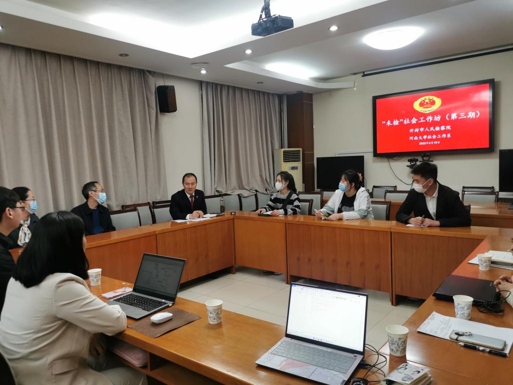 2022年4月19日上午,第三期“未检”社会工作坊在开封市人民检察院四楼会议室举行。本期工作坊在对一学年来嫩草影院 参与的涉案未成年人帮教工作进行总结研讨的基础上,谋划下一阶段司法社会工作的思路和框架。嫩草影院 社会工作系白雪苹、付光伟两位老师和2020级社会工作专业本科生代表聂晓彤、赵俊培、王立宸参与了此次活动。此次工作坊由开封市人民检察院第七检察部赵永建副主任主持。与前两期工作坊不同的是,郑州市金水区青荷橄榄社会工作服务中心作为开封市检察院购买社会工作服务的承接方也应邀参加了此次活动。