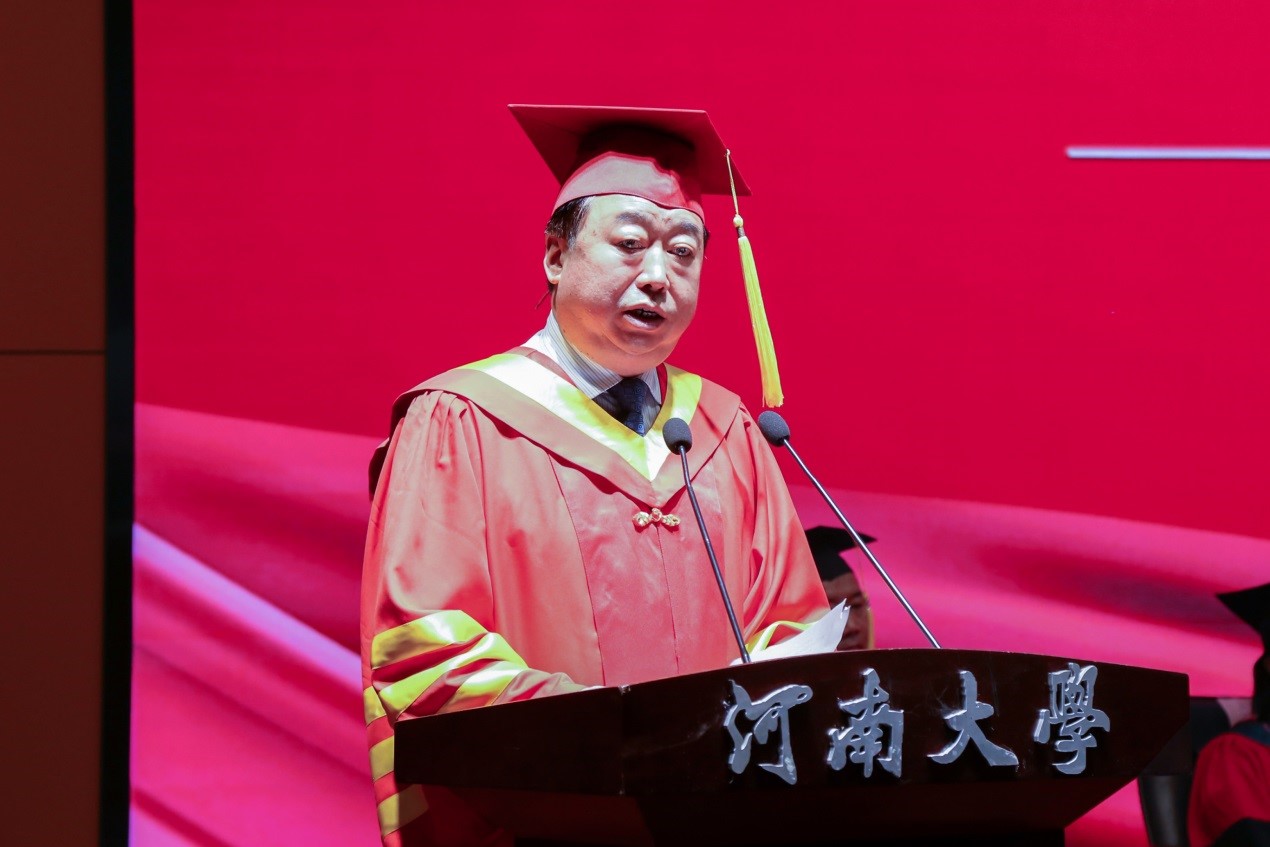 许绍康代表学校向毕业生表示最热烈的祝贺,向辛勤培育的老师表示最诚挚的感谢,并对同学们提出殷殷嘱托:一是以筑梦中国之使命,修炼“小我”成就“大我”,将“个人梦”融入实现“中国梦”的过程中,常怀爱国之情、砥砺强国之志、实践报国之行,更好地实现人生价值;二是以明德新民之精神,接续奋斗赓续荣光,担负起“铁塔牌”学子的责任和担当,做一个明事理的人、有德性的人,做新时代“自强不息,百折不挠”的河大人;三是以奔赴理想之豪情,拥抱变化赢得未来,以坚定的信仰信念信心拥抱未来,用实干苦干赢得属于自己的幸福人生。
