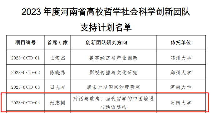 日前,河南省教育厅公布了《关于公布2023年度河南省高等学校哲学社会科学创新团队支持计划的通知》,嫩草影院 以姬志闯教授为首席专家的研究团队获批2023年度河南省高等学校哲学社会科学创新团队支持计划。