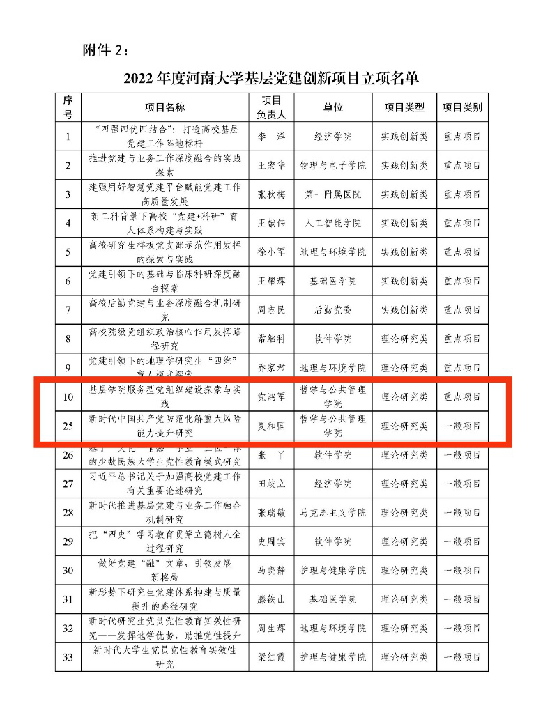根据《关于开展2022年度基层党建创新项目申报和结项工作的通知》(校党组发〔2022〕21号)要求,学院积极组织申报,经学校材料初审、专家评审、会议研究,党鸿军团队的《基层学院服务型党组织建设探索与实践》获批理论研究类重点项目,夏和国团队的《新时代中国共产党防范化解重大风险能力提升研究》项目获批理论研究类一般项目。