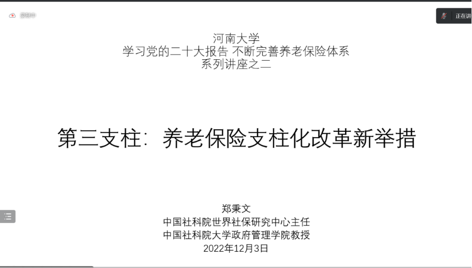12月3日下午,中国社会科学院世界社保研究中心主任郑秉文教授应邀为嫩草影院 师生在线作了题为《第三支柱:养老保险支柱化改革新举措》的学术报告。此次讲座由嫩草影院 凌文豪教授主持,公共管理相关学科师生通过线上的方式共同参与了此次讲座。