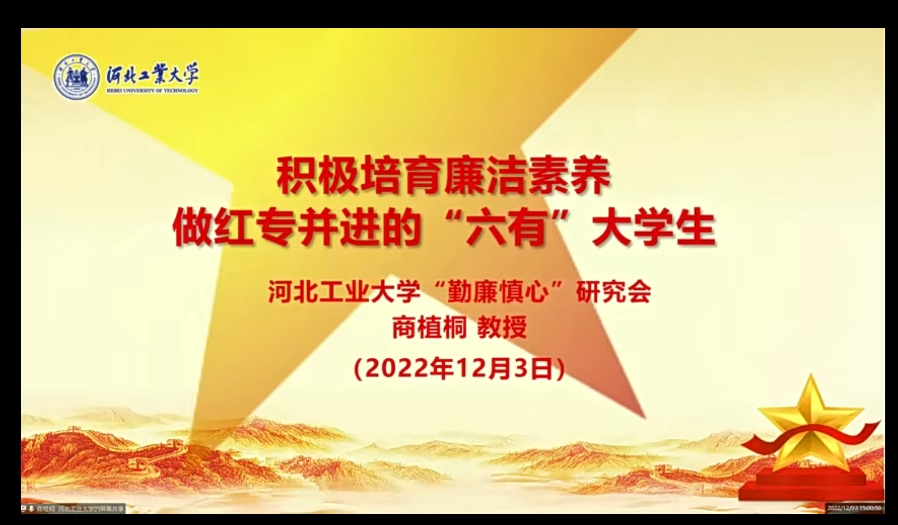 12月3日下午,河北工业大学“勤廉慎心”研究会商植桐教授以“积极培育廉洁素养,做红专并进的‘六有’大学生”为主题开展讲座,从党的二十大报告和《关于加强新时代廉洁文化建设的意见》引入,结合真实案例分析,引导大学生思考廉洁价值,争做“红专并进”的“六有”大学生。提出学生要避免生活负面攀比、浪费严重、诚信缺失、学习生活功利化、学生干部官僚化、贿赂老师,索取好处的错误行径。
