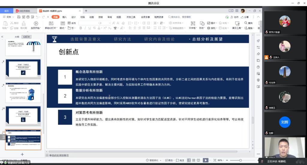 为鼓励学生将科学理论运用于社会实际,通过实践锻炼提高学术能力,12月17日,第五届“挑战杯”嫩草影院 大学生课外学术科技作品竞赛答辩于线上举行。行政管理系教授刘辉、劳动与社会保障副教授李晓玉、社会工作系副教授付光伟担任本次答辩评委,15支入围决赛团队参加答辩。