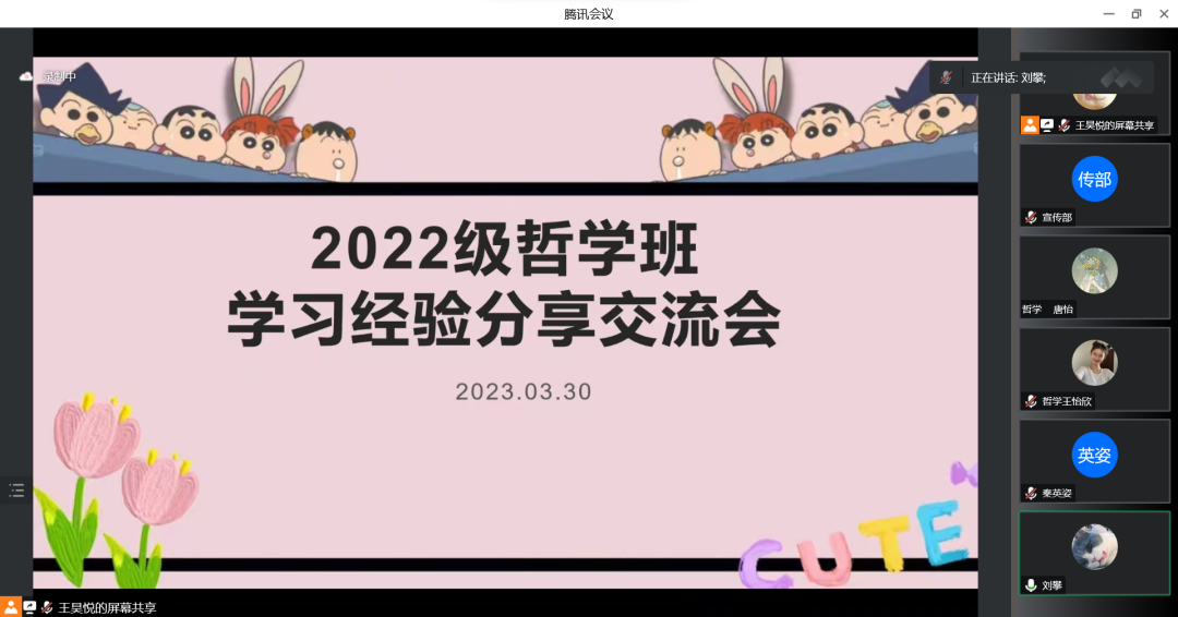 哲学专业邀请2021级刘攀和秦英姿进行学习分享。刘攀认为哲学是一门独特的人文社科,他希望同学们能体会哲学的乐趣,深入思考,探寻生活意义,成就自我价值;秦英姿介绍哲学明德班的基本情况,鼓励同学们根据自身情况进行专业分流选择,在自己热爱的领域行稳致远;2022级王恰欣建议同学们提高学习主动性,减少焦虑,保持积极进取的学习态度,以自信的姿态勇敢面对学习上的困难。