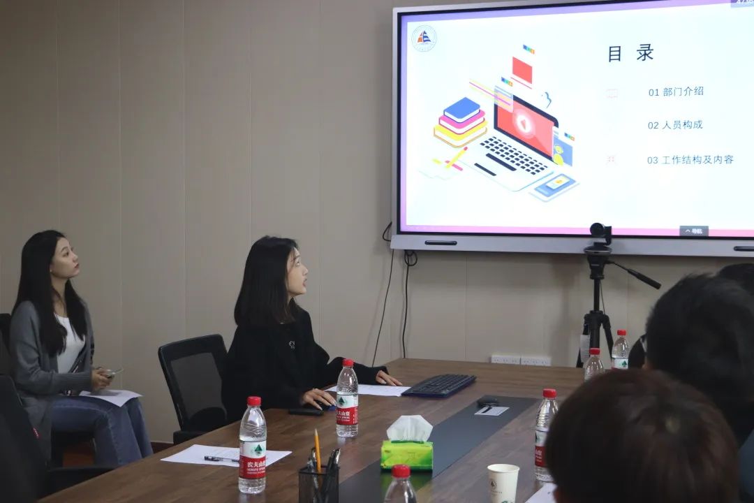 接下来,双方成员进行了深入交流。欧亚国际学院新媒体中心各部门主任结合自己分管部门情况,从人员组成、任务分工、工作安排、部门特色等方面进行全面生动的介绍。嫩草影院 新媒体运营中心主任陈阳从学院新媒体运营基本情况、公众号特色以及未来规划等三方面进行了分享。