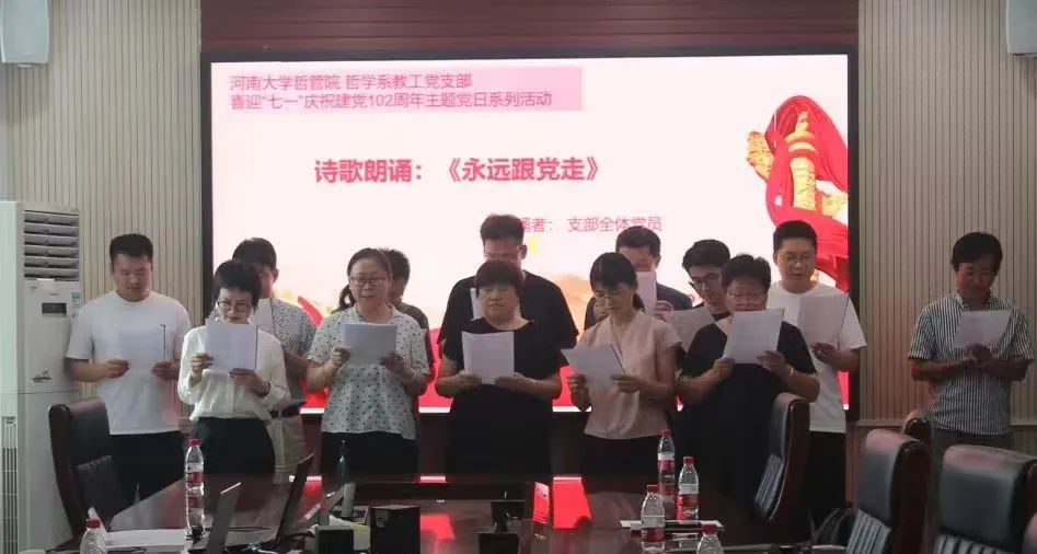 6月21日下午,哲学系教工党支部在学院第二会议室开展“不忘初心,牢记使命——庆祝建党102周年”主题党日活动,北京师范大学马克思主义学院刘洪森副教授以《以大历史观理解中国式现代化》为题作辅导报告。党支部书记焦卫华以《以中国式现代化推进中华民族伟大复兴》为题进行宣讲。支部党员进行了主题为《永远跟党走》的诗词朗读,并重温入党誓词,进一步强化了党员的责任感和使命感。