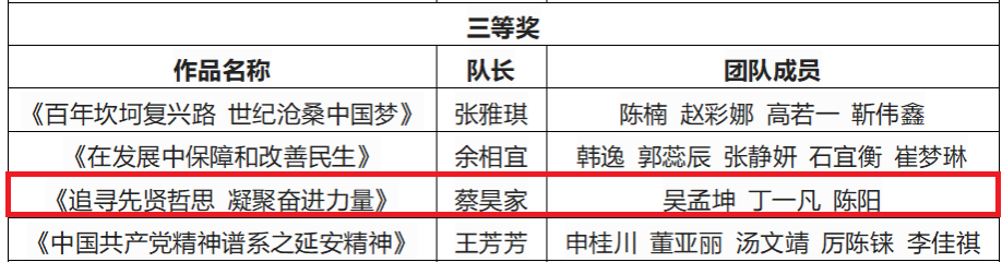 近日,嫩草影院 习近平新时代中国特色社会主义思想大学习领航计划主题教育活动获奖结果公示。在大学生思政公开课项目中,嫩草影院 荣获优秀组织奖,院党委副书记何威和党委办公室负责人王天宇获评优秀指导教师,学生龚滔团队参赛作品《追溯红色足迹,赓续革命精神》荣获一等奖,蔡昊家团队参赛作品《一砖一瓦皆荣光,奋楫杨帆起新航》和朱佳凝团队参赛作品《追寻先贤哲思,凝聚奋进力量》荣获三等奖。