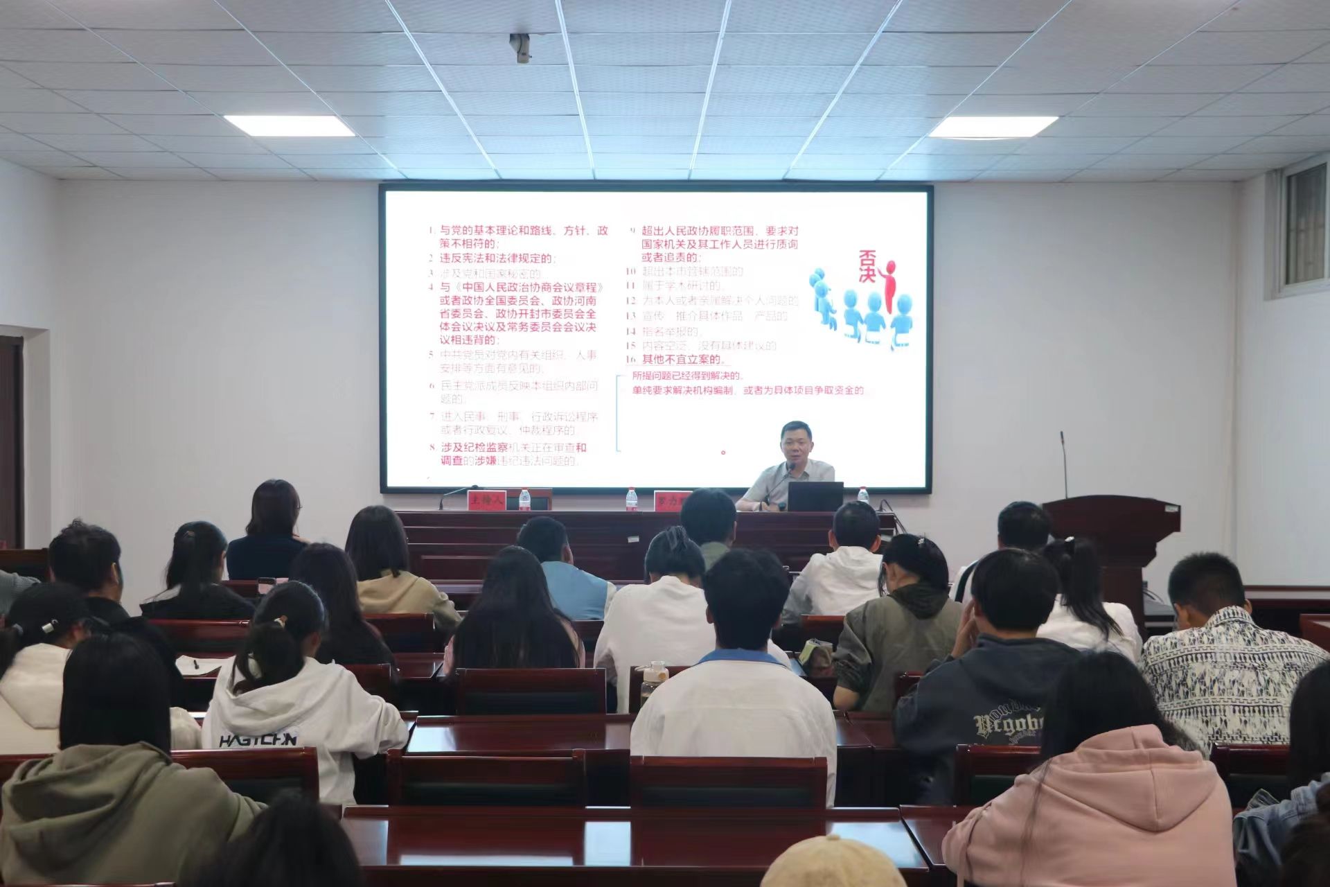 罗力鹏从中国人民政治协商会议的发展历史讲起,通过详实的案例讲解人民政协的工作方式及其在国家治理与社会发展进程中的重要作用。他表示,提案工作是人民政协一项全局性、综合性、经常性工作,是人民政协履行职能最直接、最广泛、最有效的重要方式。如今同学们处于一个充满希望的时代,一定要以习近平总书记有关提案工作的重要指示批示精神为指导,深入学习提案基本知识,把自身积累的专业知识化作解决社会问题的金钥匙,促进提案工作质量不断提升。罗力鹏从优秀提案与反面示例对比剖析,深入讲解撰写提案的基本要求、技巧与规范格式,并呼吁同学们要提高研究站位,面向调研实践,关注国家和地方发展的关键问题,为社会经济发展献计献策。