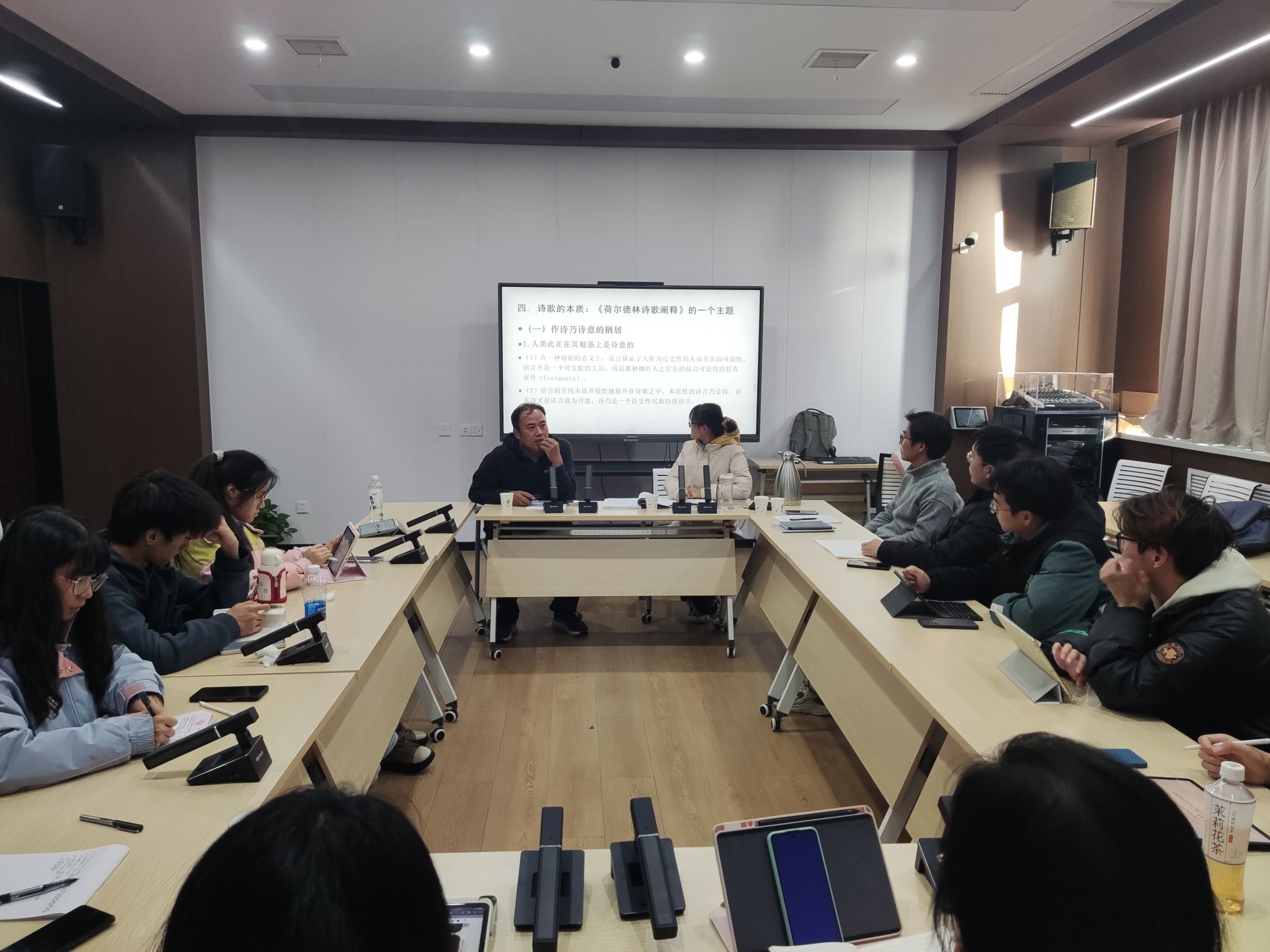 在与谈环节,刘维邦从文本中“诗”与“语言”的解释学循环出发,指出原语言、原诗和原初命名的一致性,并结合老庄哲学和具体诗歌案例阐释了“命名”的本真性、原初性、遮蔽性、复归性和民族性等问题。最后,在自由讨论环节,王中原与参与师生对解释学和历史性问题展开了深入的探讨,现场学术氛围浓厚。