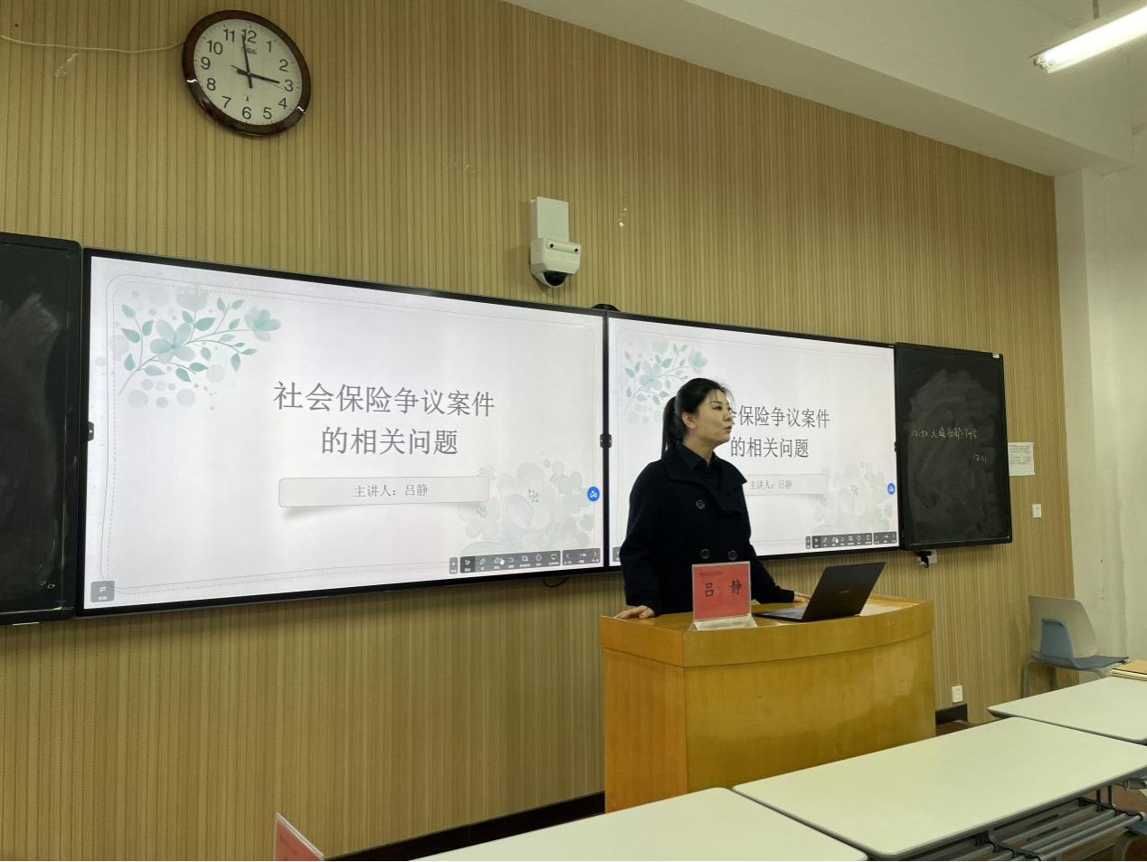 会议伊始,吕静通过介绍社会保险的险种、制度覆盖范围、关系的转移接续、相关法律责任四个方面带领同学们快速读懂社会保险法。她又带领同学们依次深入分析未依法缴纳社会保险类案件、垫付社会保险费是否属于劳动争议、缴费主体不实类案件、工商保险类案件四类案例,给予不同的观点与做法,加深同学们对于不同案例的印象、了解与解决办法,真正做到知识与实践结合。
