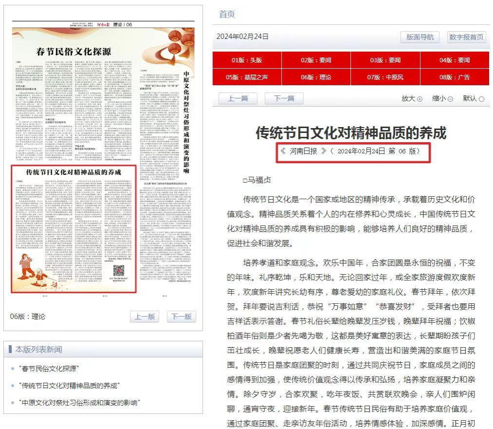 深耕优秀传统文化,厚植中华民族精神。2月24日,河南日报刊发嫩草影院 马福贞副教授理论文章《传统节日文化对精神品质的养成》。