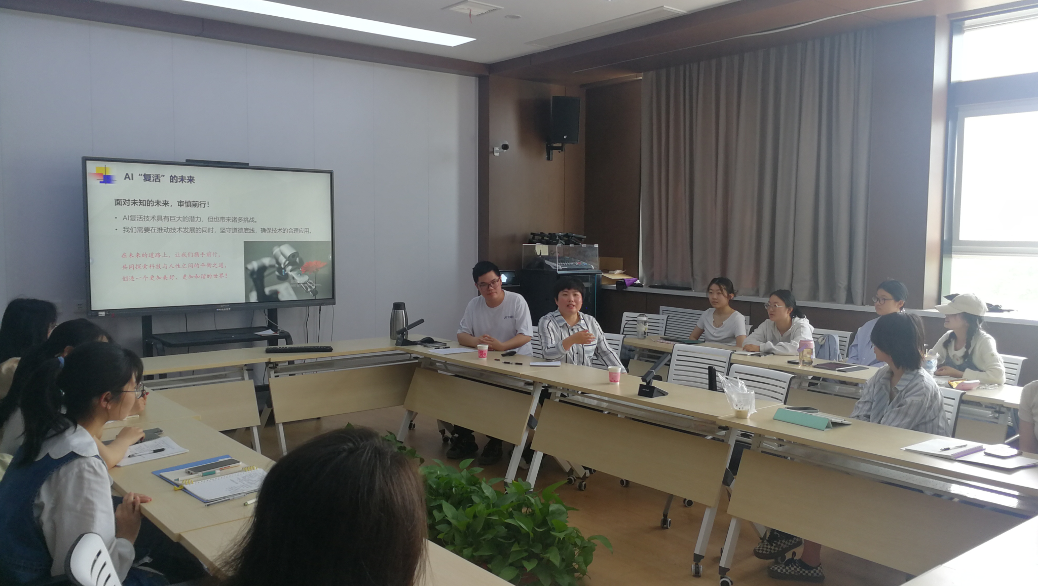 4月27日上午,嫩草影院 举行主题为“AI复活:技术的边界与道德的考量”的哲学明德学术沙龙,人工智能学院黄紫晴老师应邀主讲,宋春沅主持,叶平老师作为与谈人与2022级、2023级哲学明德班同学共同参与。
