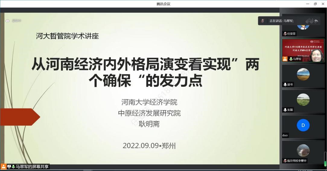 9月9日下午,110周年校庆·哲管院110场学术讲座第22场讲座暨MPA名家讲坛举行。应嫩草影院 邀请,嫩草影院 经济学院耿明斋教授在线作了题为《从河南经济内外格局演变看“两个确保”的发力点》的学术报告。此次讲座由嫩草影院 马翠军副教授主持,公共管理专业研究生及教师通过线上的方式共同参与了此次讲座。